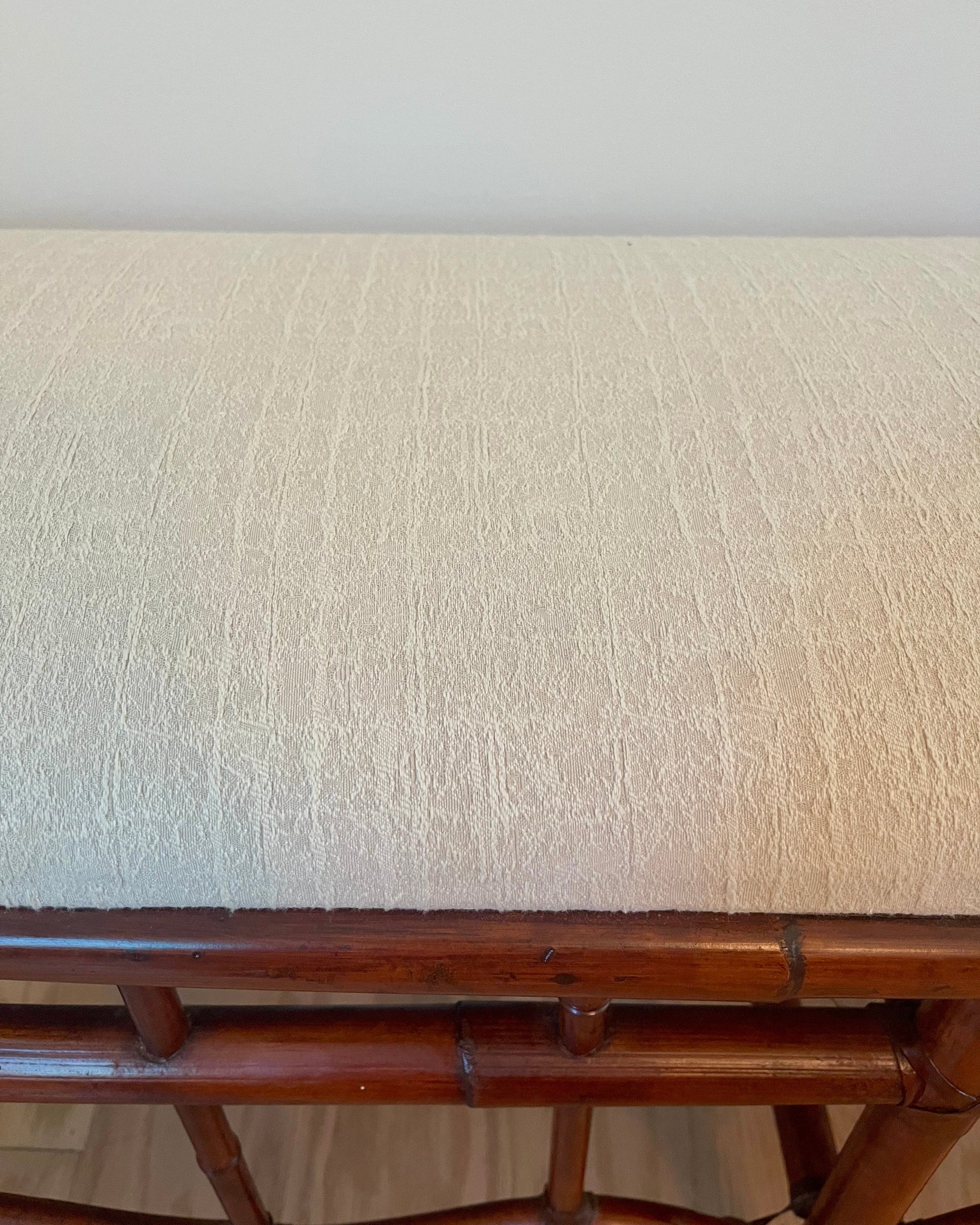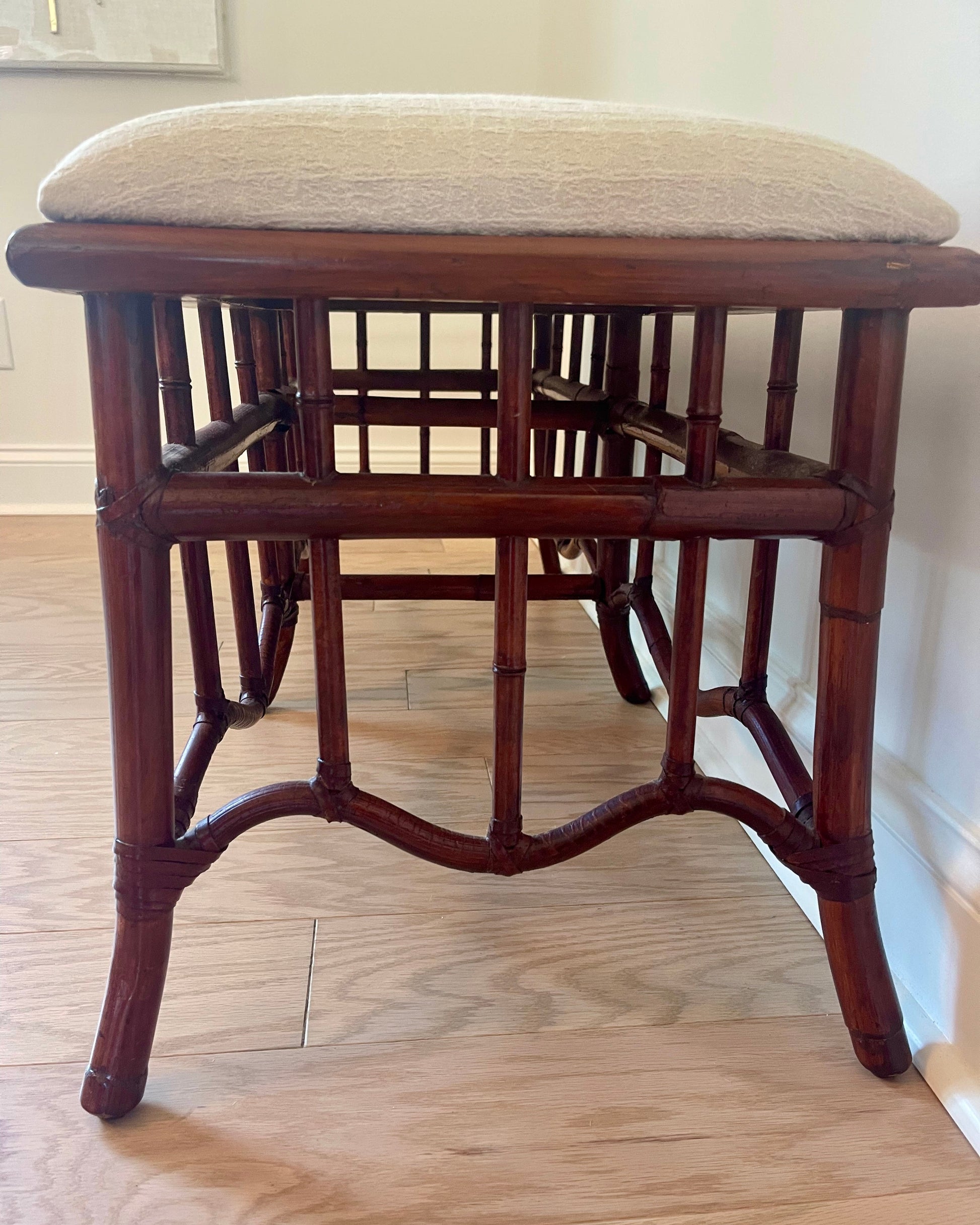 This McGuire style bamboo bench is the perfect piece for just about any room in your house! The top of the bench is currently covered in white fabric but you could easily recover yourself. 43.5Wx16Dx18H