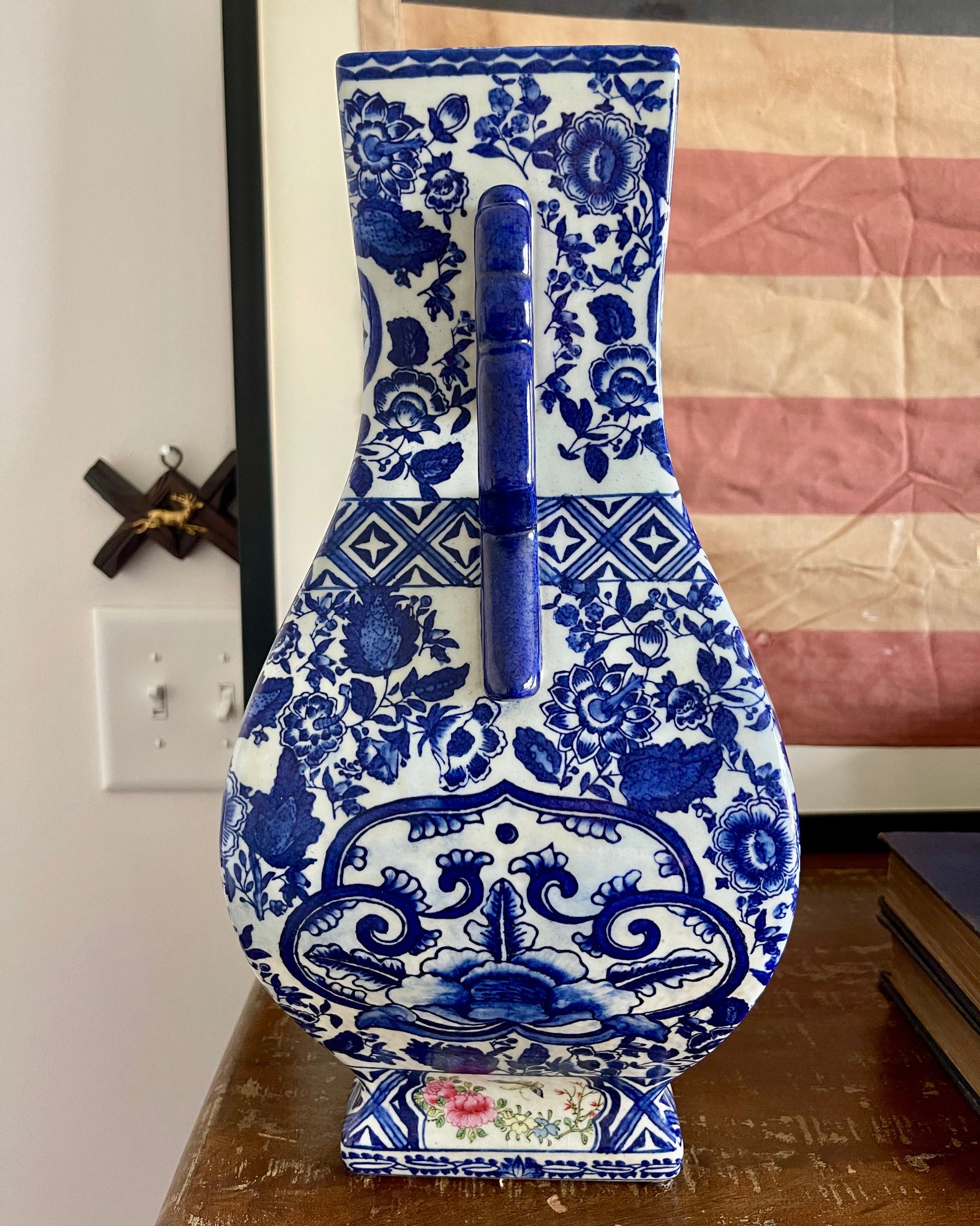 This Blue & White Vase features a hand-painted Mandarin Court Scene. Perfect for anyone that collects blue and white pieces. 14Hx9Wx6.5D