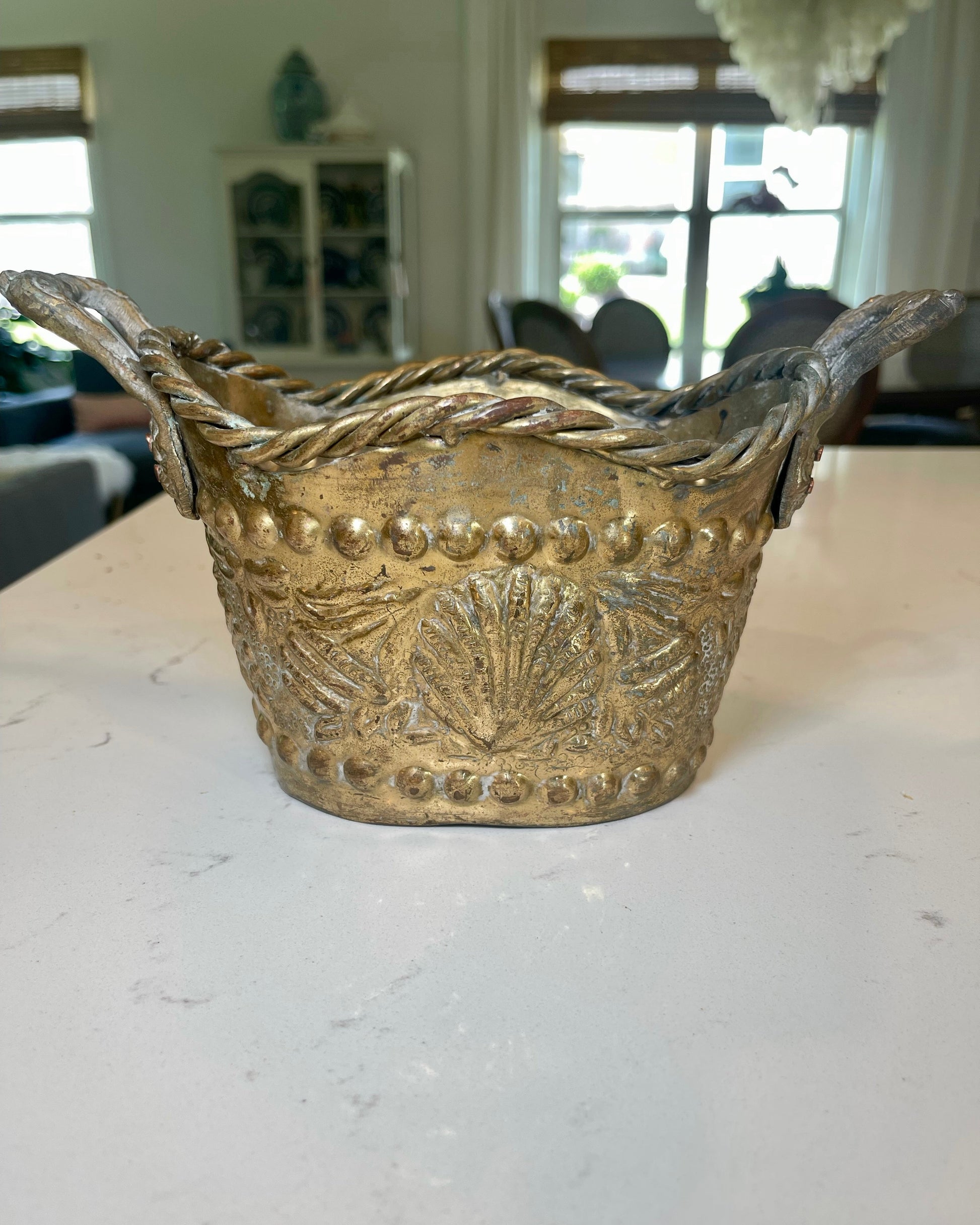 This Brass Seashell Planter features double handles and charming rope detailing. The size of this planter is perfect for a floral arrangement, house plant, or storing your favorite seashells.