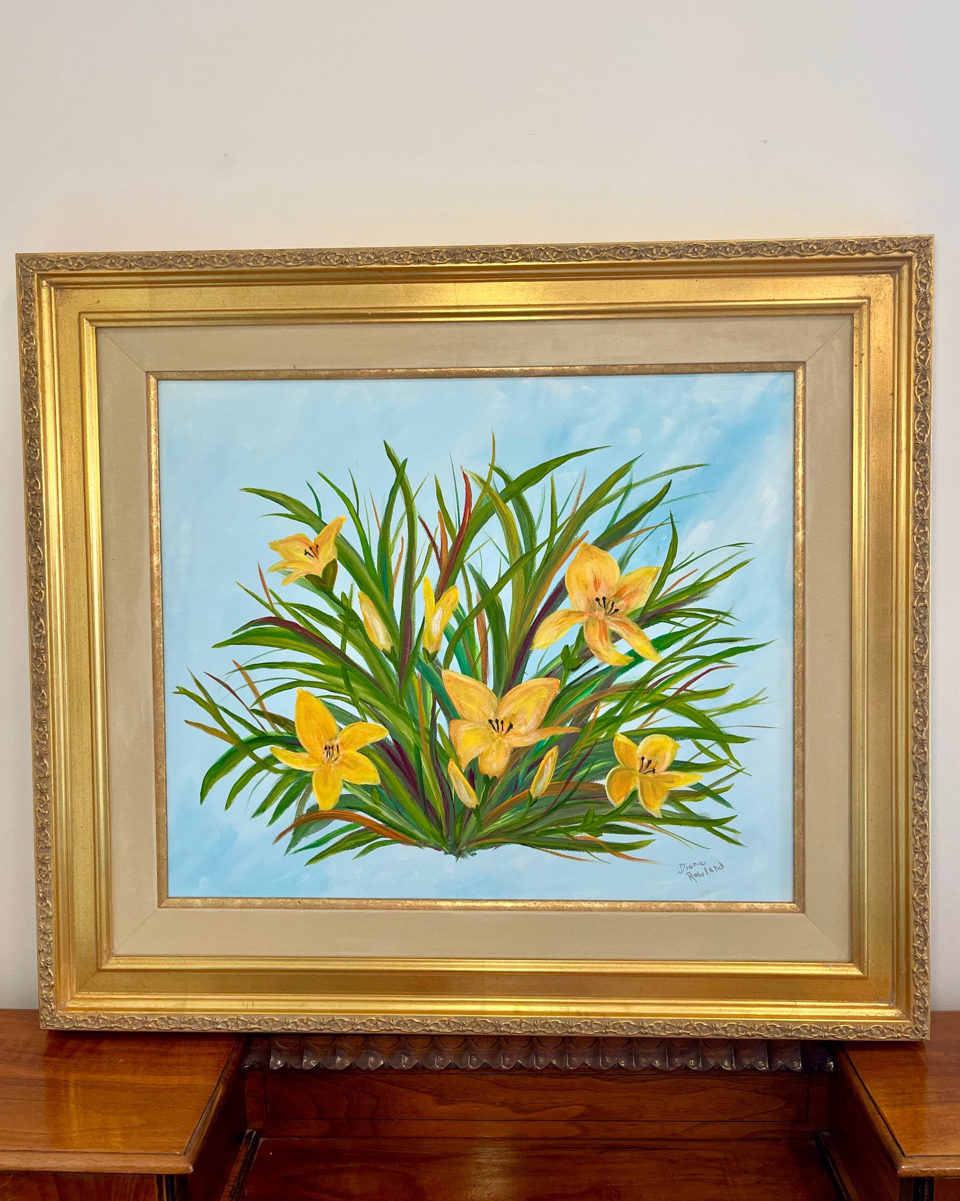 Bring sunshine into your home with this stunning framed yellow lilies painting. The luminous blooms burst with life against the canvas, creating a statement piece that demands attention. Perfect for brightening any wall! 31.5x29H