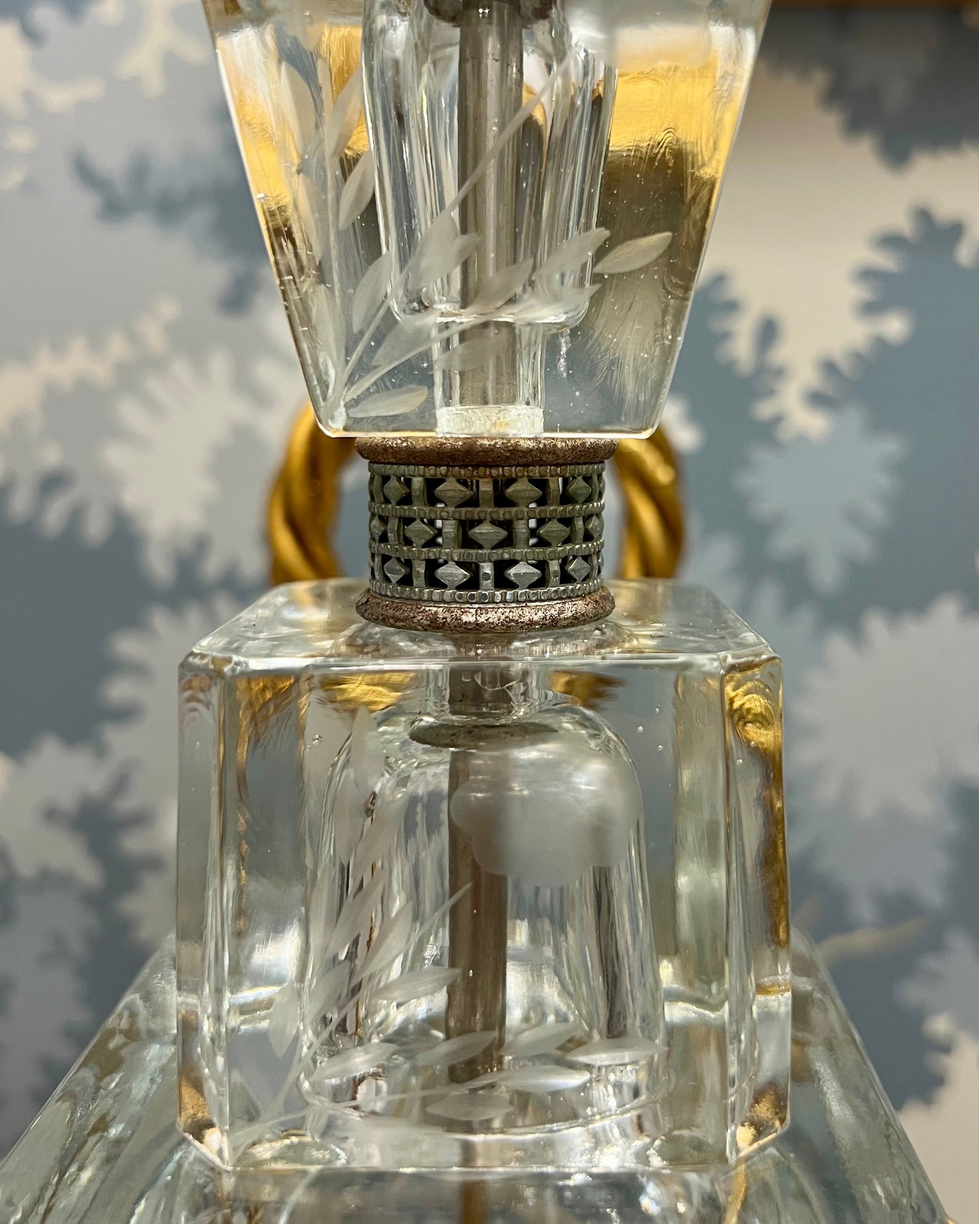 Made from high-quality glass, this lamp provides a warm and inviting light, perfect for creating a cozy atmosphere. With its delicate etchings, it adds a touch of sophistication to any space. Recently rewired. Lampshade not included.